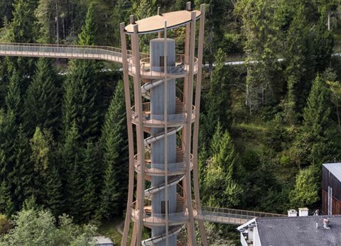 One of the project’s highlights will be the 73-metre-long slide, which visitors can use to spiral down from the trees above back to earth, designed for all of the family to experience. Four platforms with seating along the way and a unique view of the iconic alpine landscape also offer a refreshing natural experience for the whole family, with opportunities to teach children about the local flora and fauna thanks to information boards along the way.
